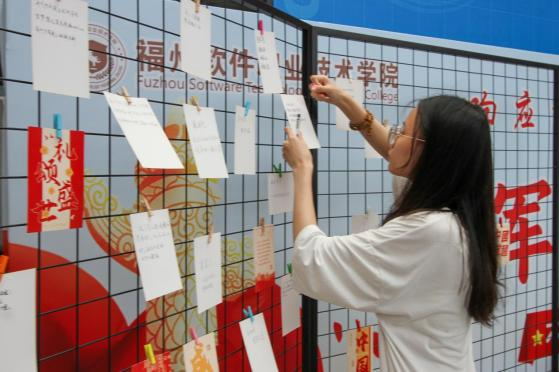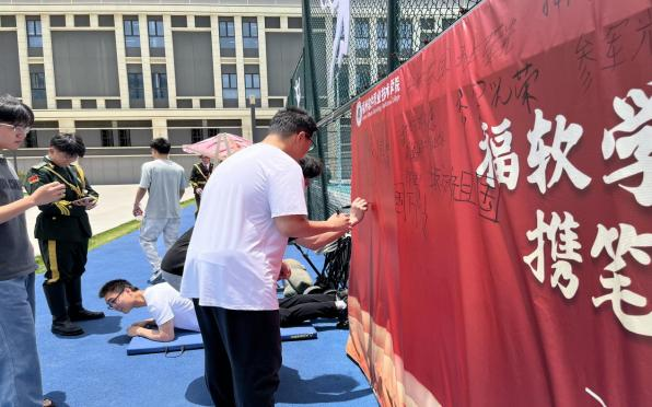 笔墨寄豪情,青春誓言筑长城。一旁的“国防祝福墙”同样人头攒动。同学们纷纷提笔,在主题展板与卡片上郑重写下对国防事业的炽热祝福和投身军营的坚定决心。一字一句汇聚成福软学子心系家国、矢志强军的磅礴力量。