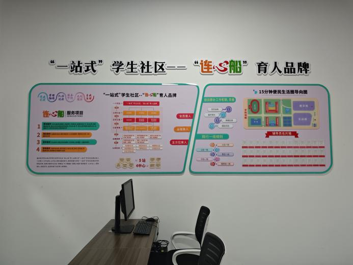 文武砂校区“连心船”一站式学生社区设立在2号楼Q212室,这里不仅是学生们的学习乐园,更是心灵的港湾。社区内部设计精巧,功能分区明确,设有党建区、思政区、征兵宣传区、服务区、调解区、心理咨询区及会议区等多个特色鲜明的区域。五站四中心的布局,充分满足了学生们在学习、咨询、党团活动等方面的多样化需求,让每一位踏入这里的学生都能感受到浓厚的文化氛围和贴心的服务。