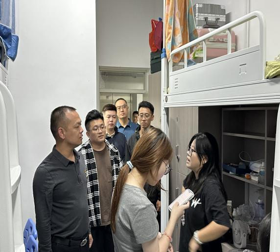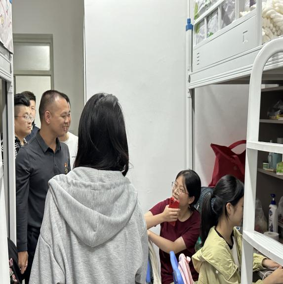 林艺勇副书记一行与同学们“拉家常、聊近况、话学业”,每到一处,都细心查看了宿舍的卫生状况和安全设施,详细询问同学们的生活情况与入学适应状况,耐心解答同学们的问题。在走访过程中,校领导们与新生们亲切交谈,言笑晏晏,氛围融洽。他们勉励新生们要尽快转变身份,适应新环境、融入新集体,珍惜光阴,努力学习专业知识,积极参与校园活动,保持健康的学习生活习惯,不断提升自己的综合素质。同时,提醒同学们要提高安全意识,防范各类诈骗,严格遵守校规校纪,注意宿舍卫生、用电安全,营造整洁和谐的宿舍环境。