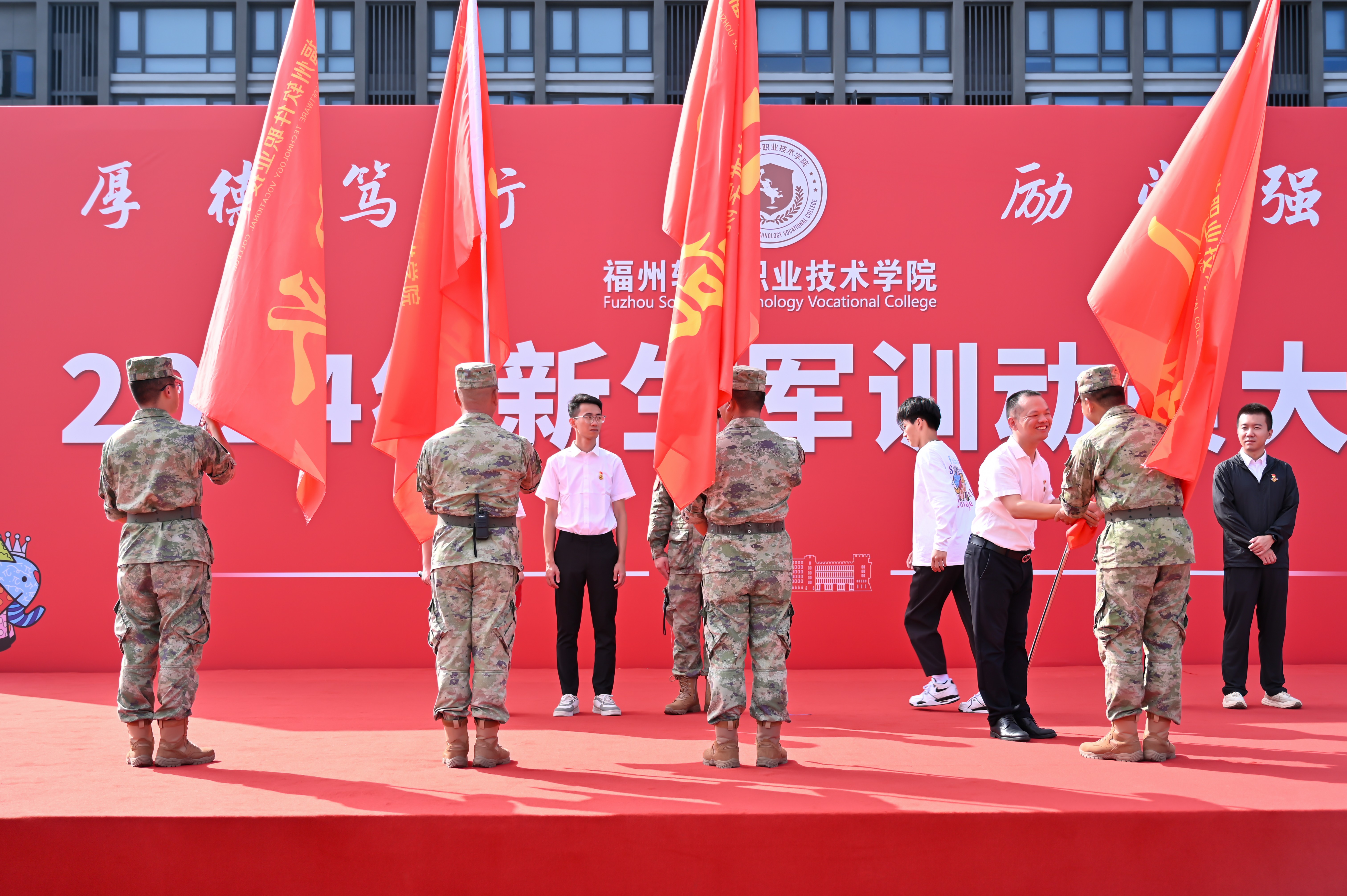 最后,由校党委副书记林艺勇为新生军训团授旗,并宣布2024级福州软件职业技术学院文武砂校区军训正式开始。