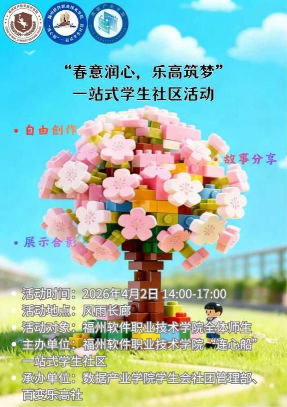 “春意润心,乐高筑梦”乐高创意搭建沙龙 | 2026年4月2日14:00-17:00 | 风雨长廊 | 围绕“我心中的春天”或“我的减压神器”自由创作,现场分享作品故事,小型拼搭作品可带走,在搭建中放松心情、释放压力。 | 主办单位:“连心船”一站式学生社区 承办单位: 数据产业学院学生会社团管理部、百变乐高社 | 在校师生 |