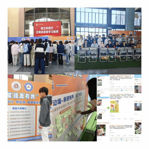 3月17日,“学在福软,课堂提质有我”倡议接力行动双校区同步举行,同学们签名写下学习承诺、宣读课堂文明公约,将课堂规范内化为自律。文明督导队每周开展班风学风建设查课工作,教学质量监督与服务委员会每周收集关于教学管理等各类反馈,推动立行立改,形成“学生反馈—学院响应—整改闭环”的治理模式。图书馆自管队提供图书借阅、自习引导等服务,协助图书馆及数字传媒影视产业学院举办勤学之星、专升本答疑等学业辅导活动,共同营造暖心互助共进的学习氛围。