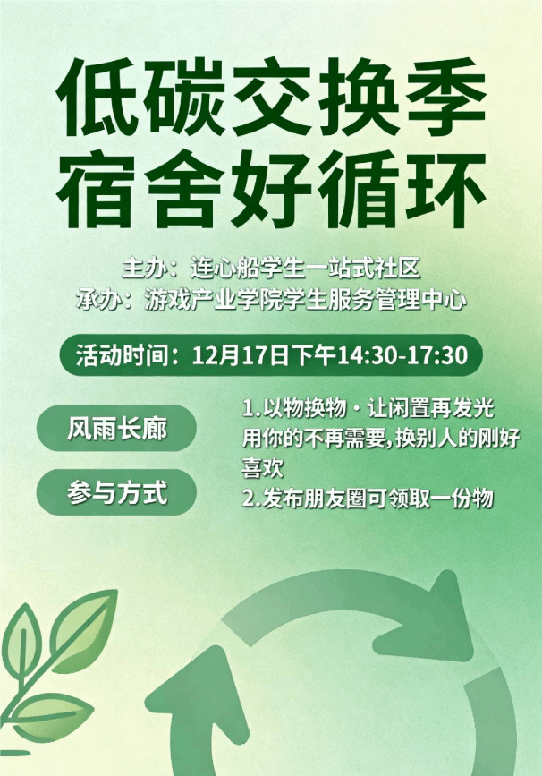 “低碳交换季,宿舍好循环”主题活动 | 2025年12月17日14:30-17:30 | 风雨长廊 | 诚邀大家携带闲置物品到场摆摊,标注物品基本信息,参与线下自由交换;交换双方自主沟通,以物易物,完成交换后可到服务台登记留念。发布朋友圈相关话题,活动当天可凭截图领取小礼品1份。 | 主办单位:“连心船”一站式学生社区 承办单位: 游戏产业学院学生服务管理中心 | 福州软件职业技术学院老师、学生 |