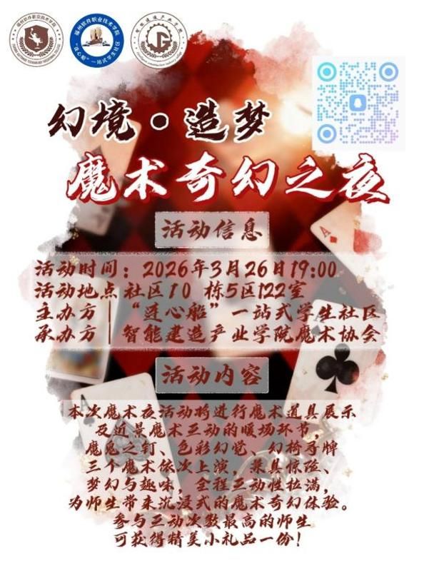 “幻镜·造梦——魔术奇幻之夜”主题活动 | 2026年3月26日19:00 | 学生社区10-5-122室 | 沉浸式观赏三大近景魔术表演,还能参与趣味互动,亲手解密魔术奥秘!活动限报35人,感兴趣可扫码加群报名。 | 主办单位:“连心船”一站式学生社区 承办单位: 智能建造产业学院魔术协会 | 在校师生 |