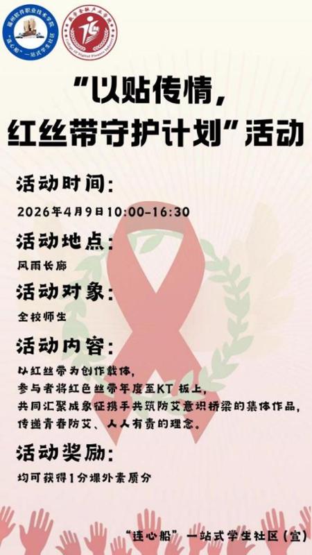 “以贴传情,红丝带守护计划”防艾宣传教育活动 | 2026年4月9日10:00-16:30 | 风雨长廊 | 以红丝带为创作载体,参与者将红色丝带年度至KT板上,共同汇聚成象征携手共筑防艾意识桥梁的集体作品,传递青春防艾、人人有责的理念。 | 主办单位:“连心船”一站式学生社区 承办单位: 数字金融产业学院团委融媒体中心 | 在校师生 |