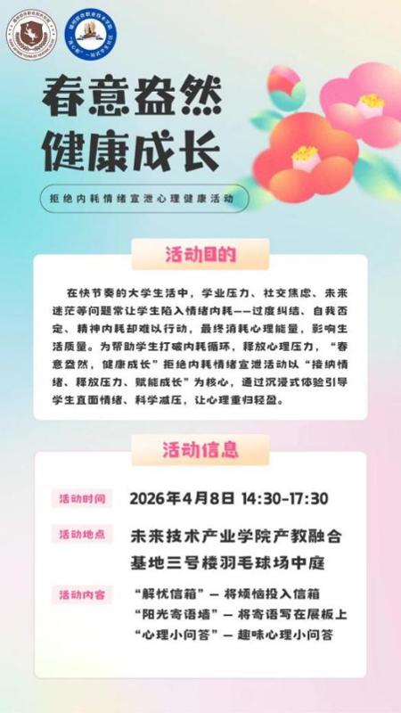 “春意盎然,健康成长”心理健康教育主题活动 | 2026年4月8日14:30-17:30 | 未来技术产业学院产教融合基地3号楼1楼羽毛球场 | 活动设置解忧信箱、阳光寄语墙、心理知识小问答等趣味环节,现场参与释放压力、悦纳情绪。 | 主办单位:“连心船”一站式学生社区 | 未来技术产业学院产教融合基地师生 |