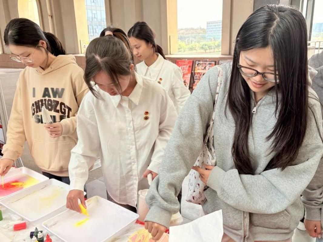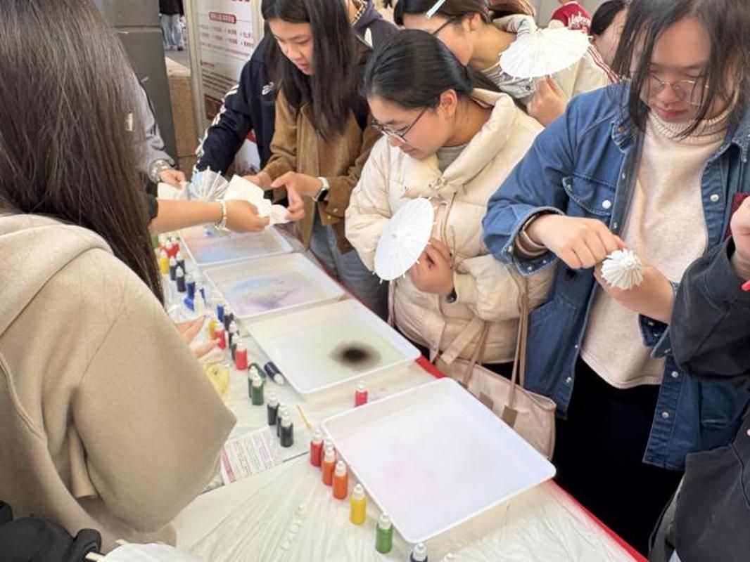 活动以纸伞为载体,将红色基因植入传统技艺。青年学子们以伞为卷,在水拓晕染间勾勒红色印记,于指尖创作中感悟初心使命。这场沉浸式体验,不仅让同学们零距离接触了非遗水拓技艺,更以艺术创新的方式,坚定了文化自信,让红色基因在青春手中薪火相传。