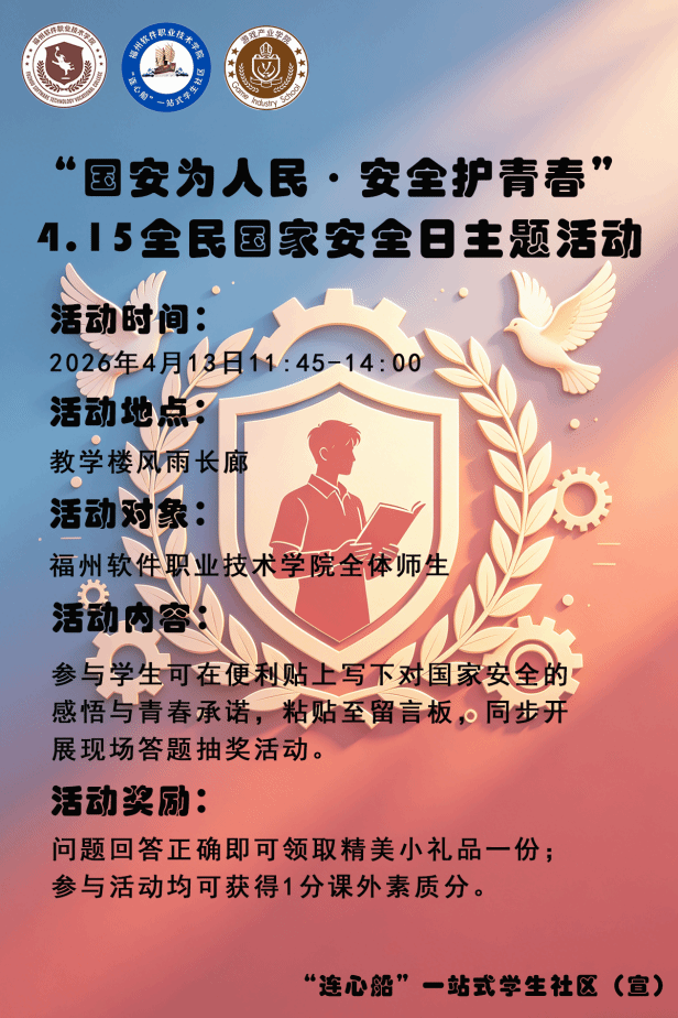 “国安为人民·安全护青春”4.15全民国家安全日主题活动 | 2026年4月13日11:45-14:00 | 风雨长廊 | 现场了解国家安全知识与故事,可参与互动留言;同步开展趣味答题抽奖,答对即可领取礼品,在沉浸式体验中增强国安意识。 | 主办单位:“连心船”一站式学生社区 承办单位: 游戏产业学院团委 | 在校学生 |