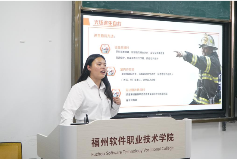本次活动由罗丽兰同学与黄健同学共同主持。活动伊始,陈崟、林伟雄两位老师在开幕致辞中分别强调了宿舍消防安全的重要性,号召同学们提高防范意识,筑牢校园安全防线。随后,苏紫茵同学围绕火灾成因、预防措施及消防器材使用规范等内容,开展了专题知识讲座。结合视频演示与真实案例分析,深入剖析火灾隐患,讲解消防器材使用与操作要点,提升同学们的认知与应对能力。