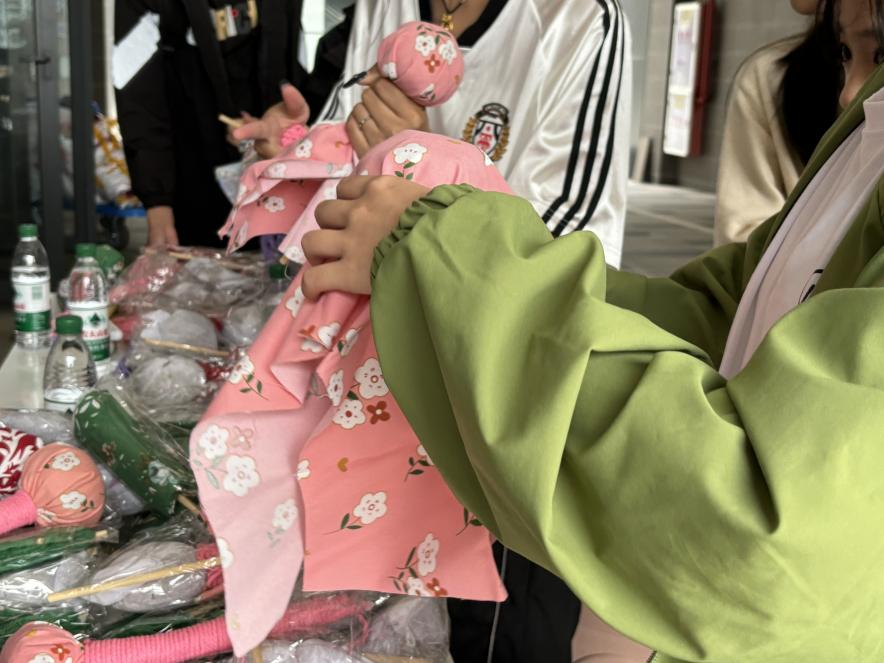 活动期间,艾草锤DIY摊位前始终人气高涨、暖意融融。参与师生围坐一堂,认真聆听工作人员讲解立冬养生知识,详细了解艾草锤驱寒除湿、舒缓疲劳的实用功效,学习穴位按摩的正确方法。随后,在工作人员的现场示范与耐心指导下,大家纷纷动手实操:整理压实干艾草,用棉麻布细心包裹,填入填充料增强硬度,再以彩绳交叉捆扎固定,大家在亲手制作中感受传统养生智慧,不仅收获了实用的专属养生工具,更在互动体验中激发了对冬日健康生活的关注与热情。