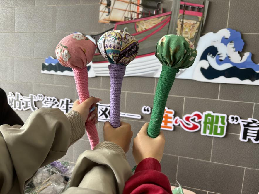 同学们将亲手制作的艾草锤轻轻捧在掌心,让艾草锤在冬日里传递健康。那些精心填充的艾草、细致捆扎的彩绳,以巧思为针线,将驱寒除湿的功效与手作的温度紧密缝合。每一把艾草锤都是一次沉浸式的养生体验,每一份成品都是健康生活的贴心守护,让传统养生智慧与动手实践的乐趣,在校园里悄然流淌,温暖过冬。